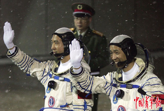 2005年10月12日早晨,酒泉卫星发射中心问天阁前,即将搭乘神舟六号飞船飞往太空的航天员费俊龙(左)、聂海胜,向冒雪前来送行的各界人士挥手道别。9时整,运载神舟六号飞船的火箭点火升空。10月17日,神舟六号返回舱成功着陆,航天员平安返回。中青报·中青网记者郑萍萍/摄