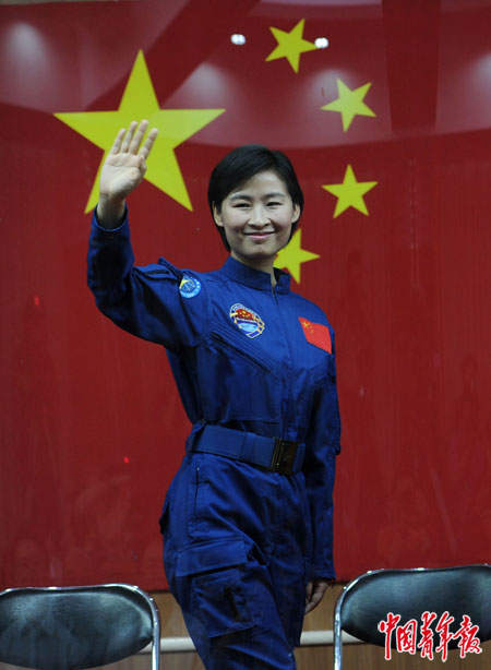 2012年6月15日,在酒泉卫星发射中心航天员公寓问天阁,我国首位女航天员刘洋在国旗前挥手。当日,天宫一号与神舟九号载人交会对接任务航天员刘洋和队友景海鹏、刘旺首次公开亮相,并回答了中外记者提问。赵青/摄