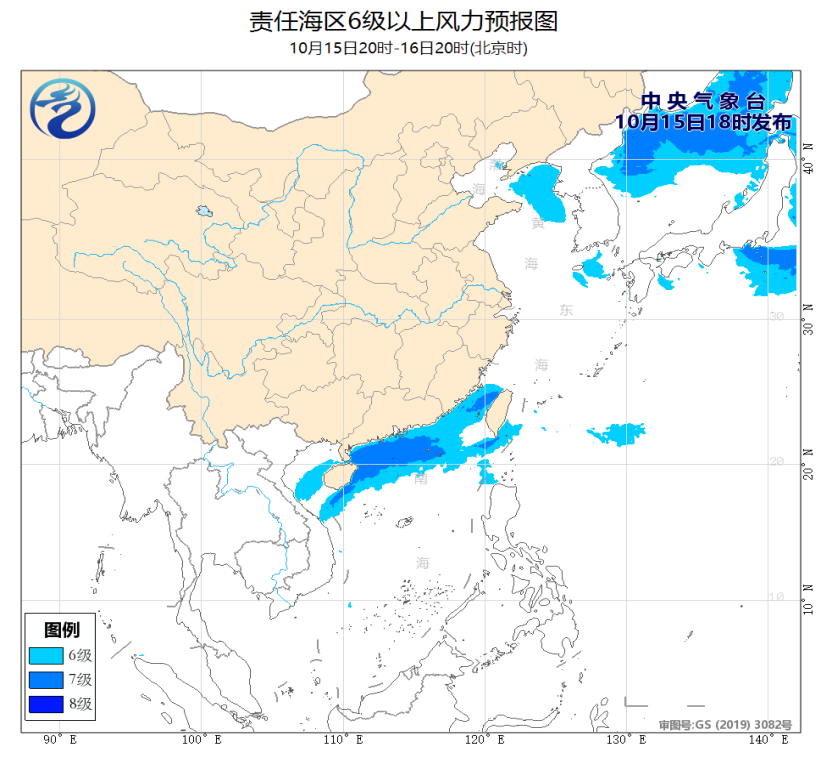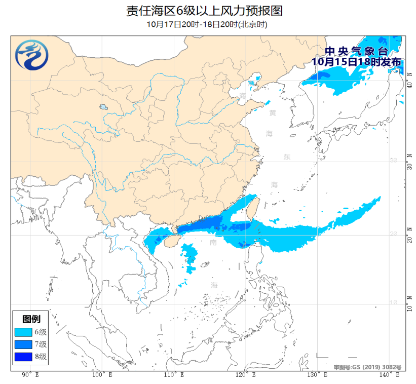 10月18日夜间至22日白天,受冷空气影响,渤海、渤海海峡、黄海大部海域、东海大部海域、台湾海峡、巴士海峡、南海北部和中部海域、北部湾、琼州海峡将有5~7级、阵风8级的东北风或偏北风,其中台湾海峡的部分海域风力可达8级、阵风9级。