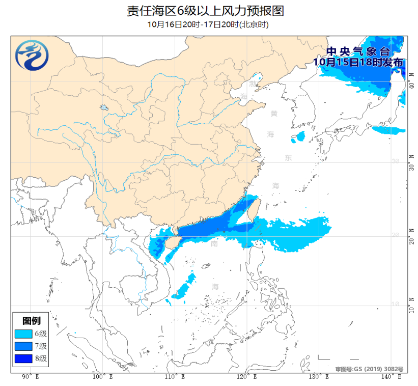 15日夜间至18日白天,台湾海峡、台湾以东洋面、巴士海峡、南海北部和中部海域、北部湾、琼州海峡将有6~7级、阵风8~9级的偏北或东北风。