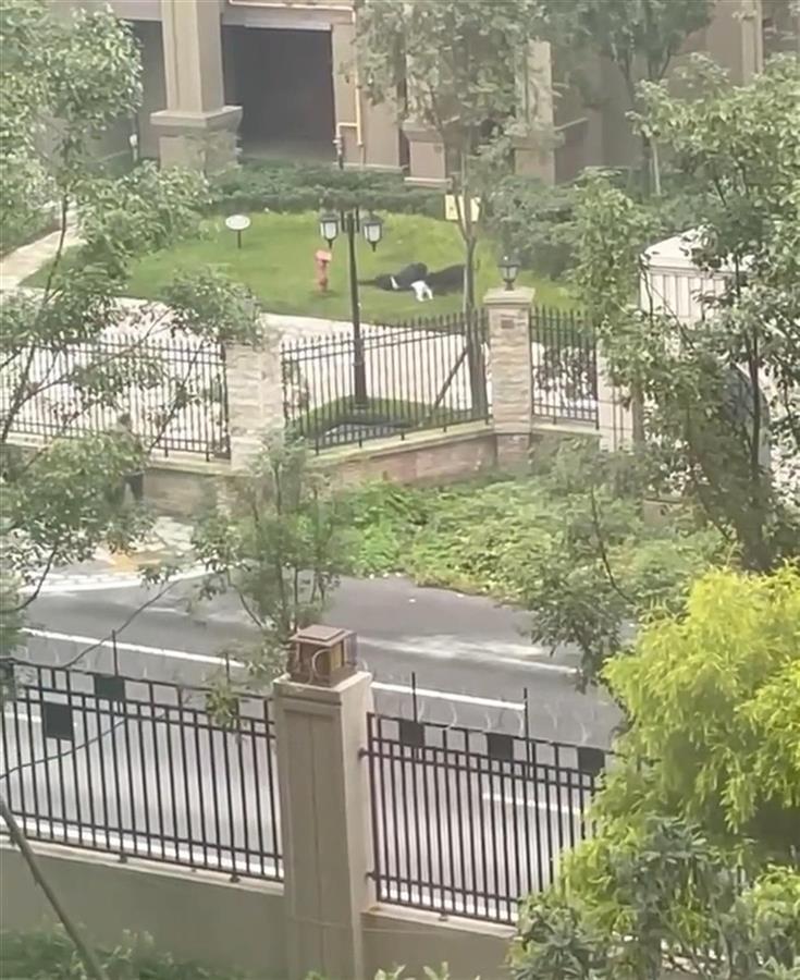 10月16日上午8时许,小区内逗留的黑色罗威纳犬突然扑向刚走出单元门的邓女士和晗晗,草坪上不断传出撕心裂肺的呼救声。邓女士紧紧护着女儿,而罗威纳犬却多次扑咬,不肯松口。一名保洁阿姨拿着拖把上前驱赶,撕咬持续了40多秒,陆续有业主赶来,罗威纳犬这才仓皇逃离。
