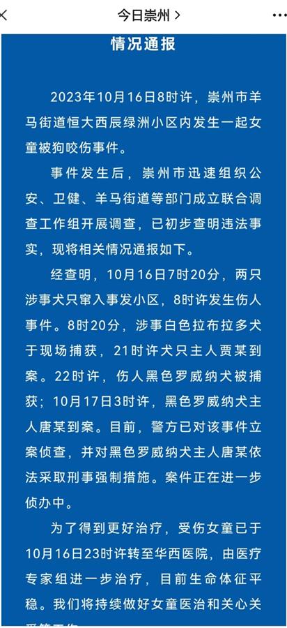 据崇州官方17日通报,10月16日7时20分,两只涉事犬只窜入事发小区,8时许发生伤人事件。8时20分,涉事白色拉布拉多犬于现场捕获,21时许犬只主人贾某到案。22时许,伤人的黑色罗威纳犬被捕获。10月17日3时许,黑色罗威纳犬主人唐某到案。目前,警方已对该事件立案侦查,并对黑色罗威纳犬主人唐某依法采取刑事强制措施。案件正在进一步侦办中。
