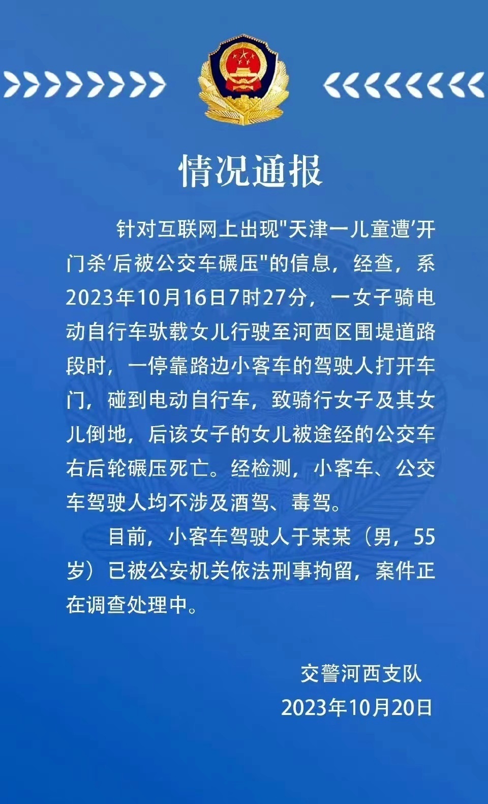 针对互联网上出现“天津一儿童遭‘开门杀’后被公交车碾压”的信息,经查,系2023年10月16日7时27分,一女子骑电动自行车驮载女儿行驶至河西区围堤道路段时,一停靠路边小客车的驾驶人打开车门,碰到电动自行车,致骑行女子及其女儿倒地,后该女子的女儿被途经的公交车右后轮碾压死亡。
