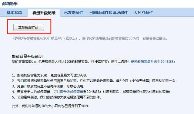 在此提醒大家,免费扩容的条件是邮箱的实际使用容量超过了50%,通过这个按钮即可让邮箱容量翻倍。通过这个办法,最多可扩容到16GB,已经能满足多数用户的使用需求了。