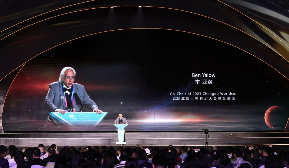 10月22日晚,在第81届世界科幻大会闭幕式上,2023成都世界科幻大会联合主席本·亚洛致辞。新华社发