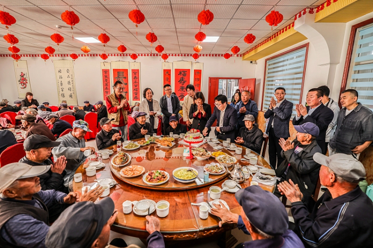 10月21日,青岛一社区举行重阳节“百寿宴”活动。图自视觉中国