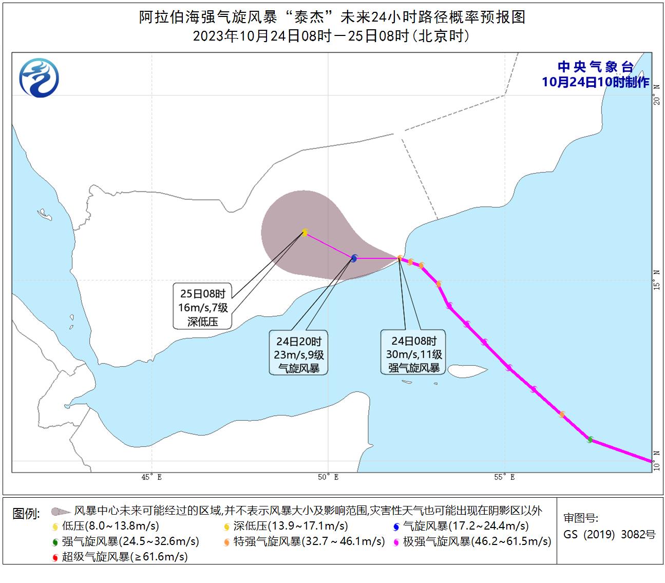 预报结论:“泰杰”已于今天早晨5点前后登陆也门基什恩东部沿海(11级,30米/秒,强气旋风暴级,相当于我国的强热带风暴级),预计,“泰杰”将以每小时15-20公里的速度向偏西方向移动,强度迅速减弱。受其影响,24日下午至25日中午,阿拉伯海西部将有6~8级、阵风9~10级,也门东部沿岸海域风力可达9~10级、阵风11~12级,也门东部、阿曼西南部将有暴雨到大暴雨,局地特大暴雨(超过400毫米)。