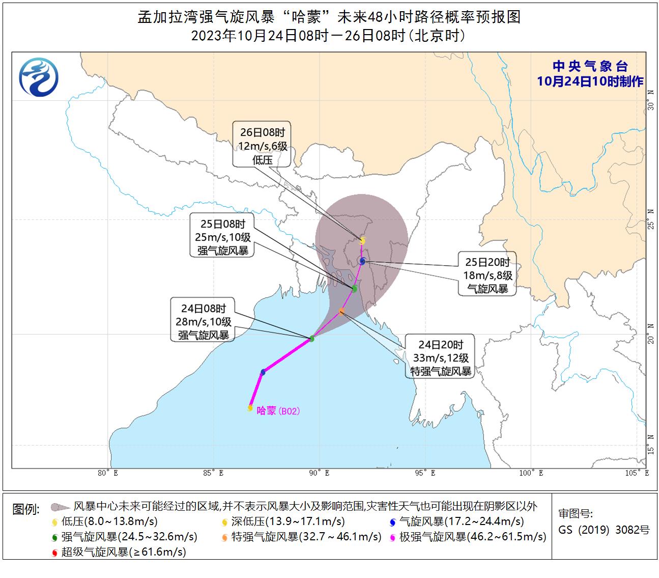 预报结论:“哈蒙”已于昨天(23日)晚上在孟加拉湾北部海面生成。预计,“哈蒙”将以每小时15-20公里的速度向东北方向移动,强度将有所增强,之后逐渐减弱,将于25日白天登陆孟加拉国东南部沿海。受其影响,孟加拉湾北部海域将有7~9级、阵风10~11级,“哈蒙”中心经过的附近海域风力可达10~11级、阵风12~13级。