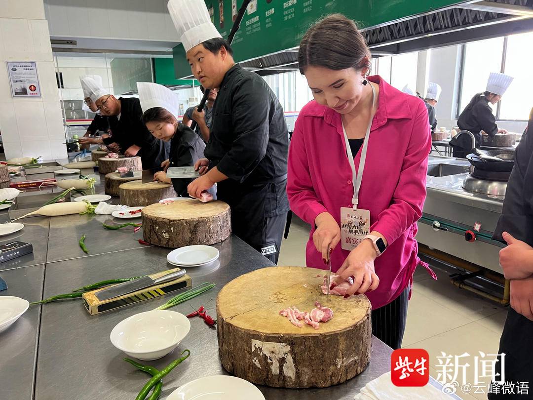 徐梦瑶,苏州人,今年大三,她对于中餐、西餐、面点制作都很有兴趣。在现场,外媒记者和大家互动,现场学习切菜,其乐融融。