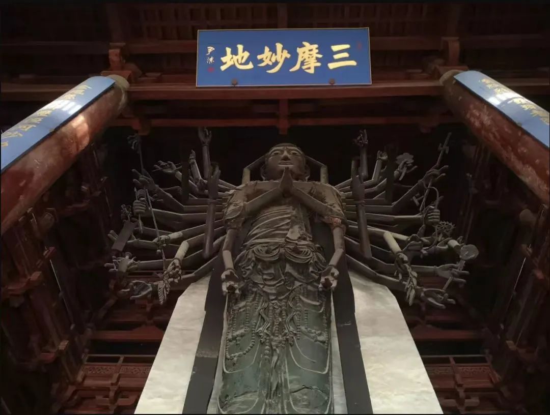 石家庄正定隆兴寺大悲阁中屹立着一尊铜铸千手观音菩萨像,距今已1000多年。这尊千手观音像也被俗称为“正定府大菩萨”,像高21.3米,共42臂,立于2米多高的石质须弥座上,除本身的两只手、眼外,在身体左右各有20只手,分别执日、月、净瓶、金刚杵、宝剑等法器。是我国现存古代最高的铜铸立式佛教造像,也是世界上古代铜铸佛像中最高大、最古老的千手千眼观世音菩萨像。