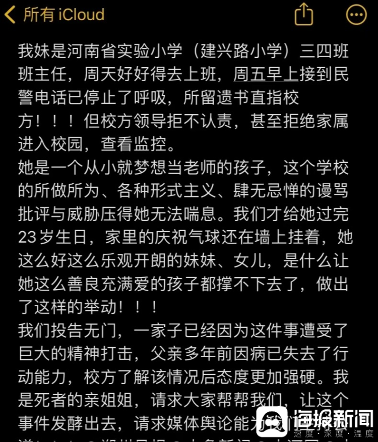 31日上午,河南网友吕女士发帖称自己的妹妹“是河南省实验小学(建兴路小学)三四班班主任,周天(10月22日)好好去上班,周五早上接到民警电话已停止了呼吸,所留遗书直指校方!但校方领导拒不认责,甚至拒绝家属进入校园,查看监控。”