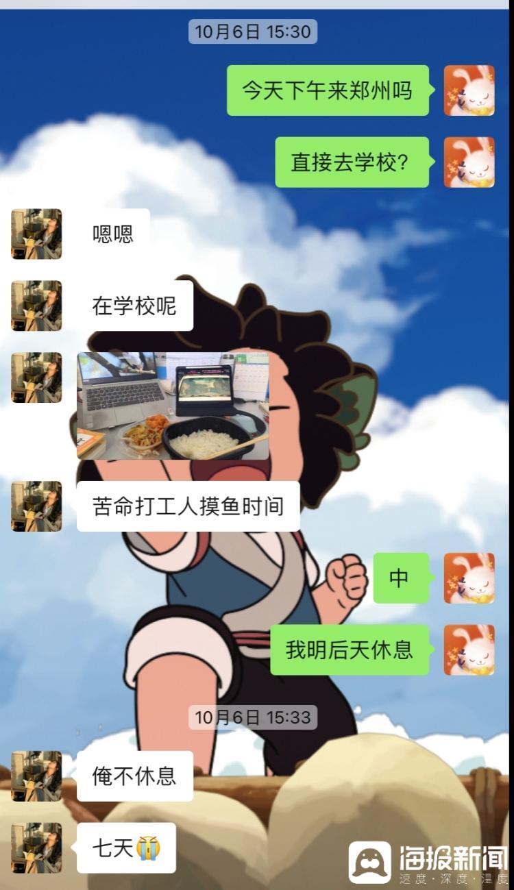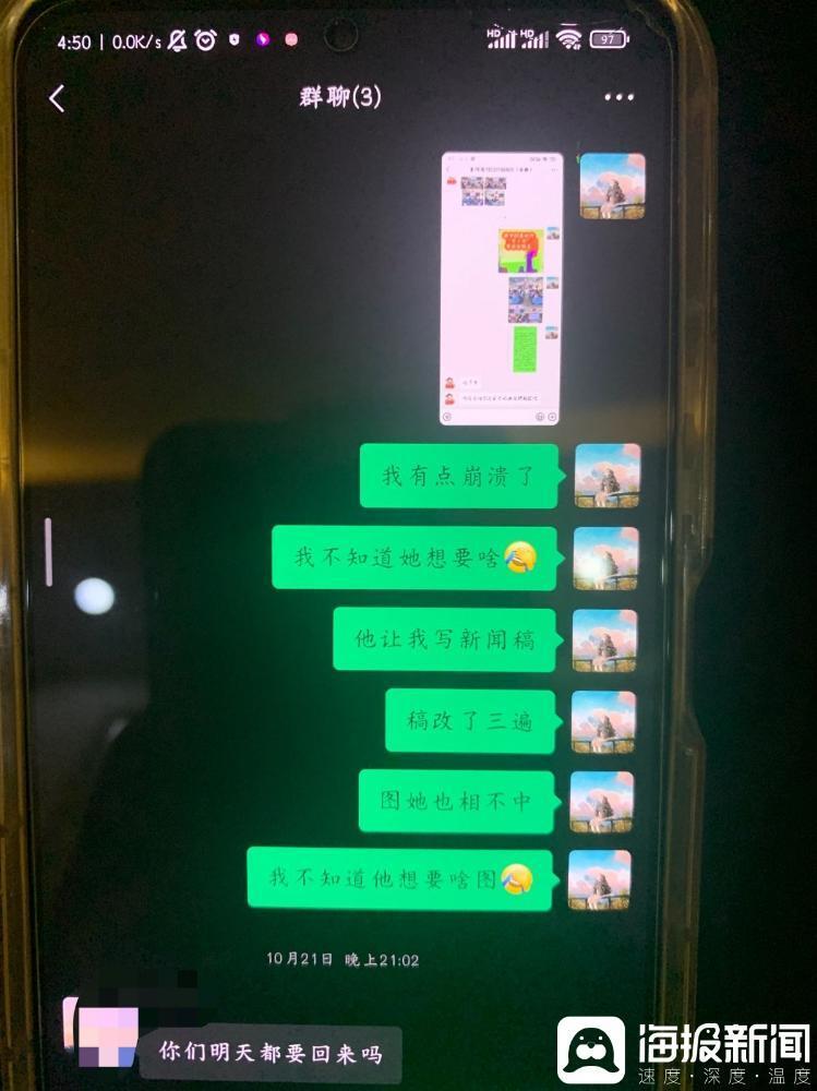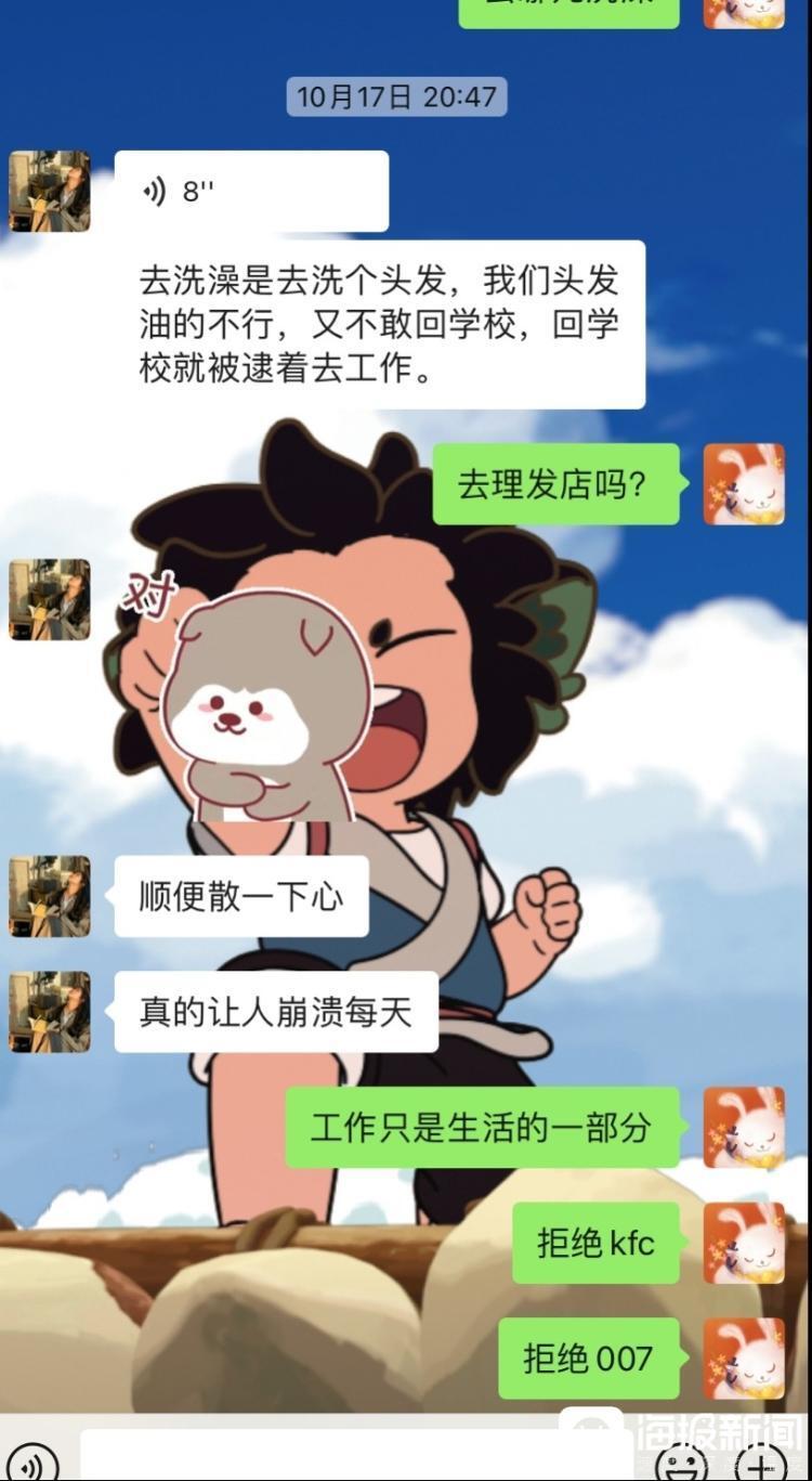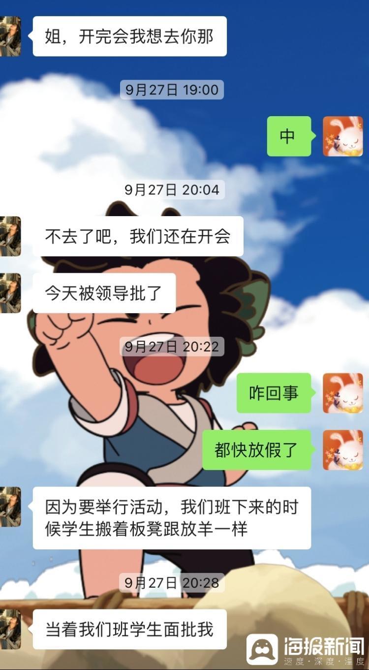 吕女士给记者提供的聊天记录中显示,妹妹在9月27日晚上8点称“还在开会”“被领导批评了”“当着我们班学生面批我”;10月6日下午提到“在学校”“7天”“不休息”等;10月11日,她给姐姐发信息说“昨晚凌晨一点才回宿舍,真不容易”;10月17日晚上,她在聊天中跟姐姐吐槽“我们头发油的不行,又不敢回学校,回学校就被逮着去工作”“真的让人崩溃每天”。