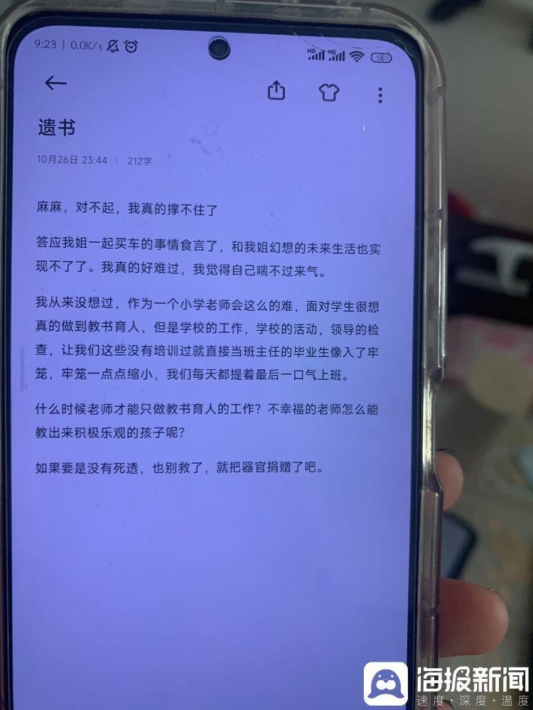 妹妹跳楼自杀后,她从警方那里拿回妹妹的手机,发现妹妹26日当晚自杀前于23:44写了一份遗书,遗书中称“真的撑不住了”“好难过,我觉得自己喘不过来气”“从来没想过,作为一个小学老师会这么的难”……记者注意到,她在遗书中还表示,“面对学生,很想真的做到教书育人,但是学校的工作,学校的活动,领导的检查,让我们这些没有培训过就直接当班主任的毕业生像入了牢笼,牢笼一点点缩小,我们每天都提着最后一口气上班。什么时候老师才能只做教书育人的工作?不幸福的老师怎么能教出来积极乐观的孩子呢?”