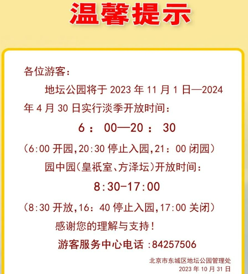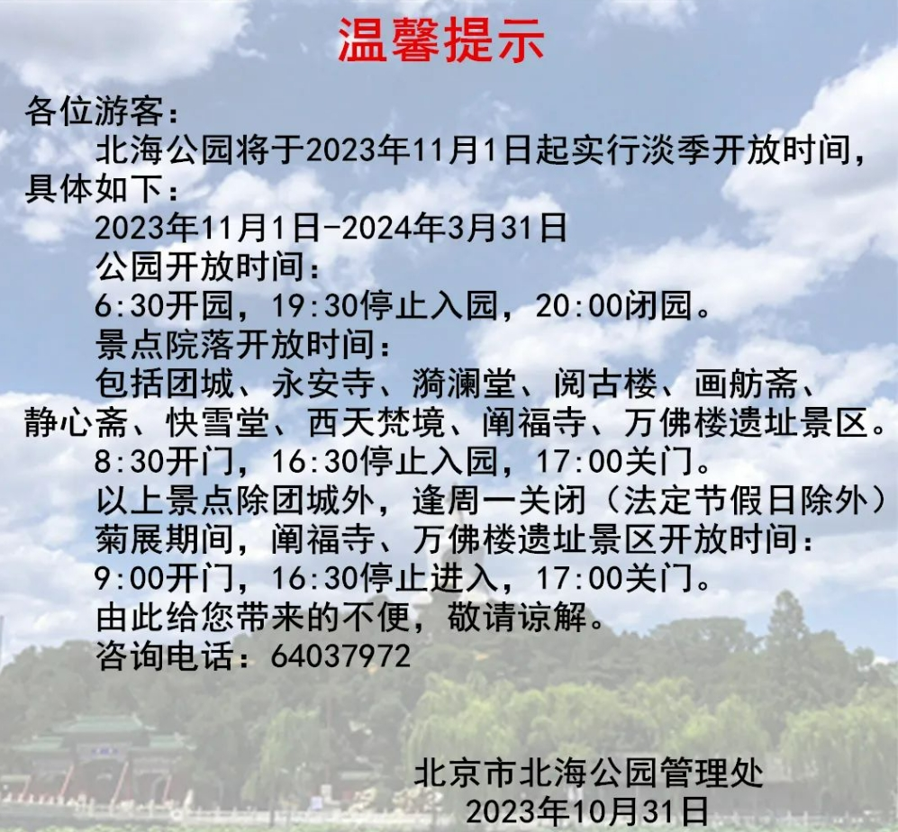 央广网北京11月1日消息(记者秦立玲)进入11月,北京多家公园景区开始实行淡季管理,开放—闭园时间也有所调整。游客出行要注意查看目的地公园景区官方发布的开放时间等信息。