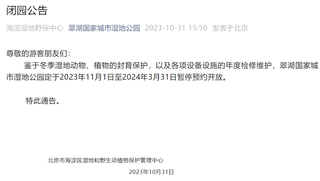 11月1日起,翠湖国家城市湿地公园暂停预约开放