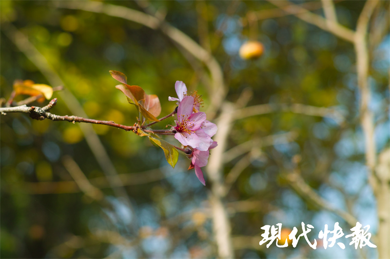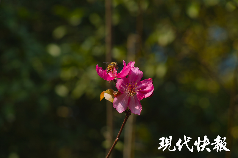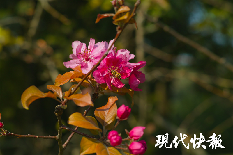 11月3日,现代快报记者来到虹桥坊西侧的绿地看到,这里有数棵海棠,树叶已经落尽,还有不少果实挂在枝头。而本该在春日绽放的海棠花,竟然有几朵傲立在秋日的暖阳里,一旁还有几个花骨朵含苞待放,更有蜜蜂不时飞过来采蜜,不少市民游客啧啧称奇,纷纷拿出手机拍照留念。