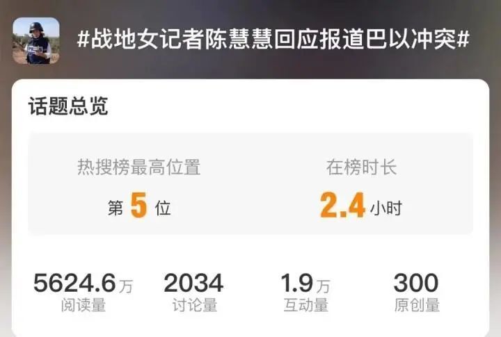 她不断发回的一线信息,让人们看到了巴以冲突战场上的情况,也让国内的网友们牵挂起了中国战地记者们的安全情况。也正是来自千千万万人的牵挂和担心,让“战地记者陈慧慧”这个名词冲上了热搜。