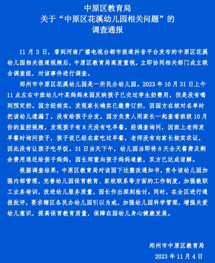 11月4日,针对女童上幼儿园19天8天没有早饭,河南郑州中原区教育局发布通报: