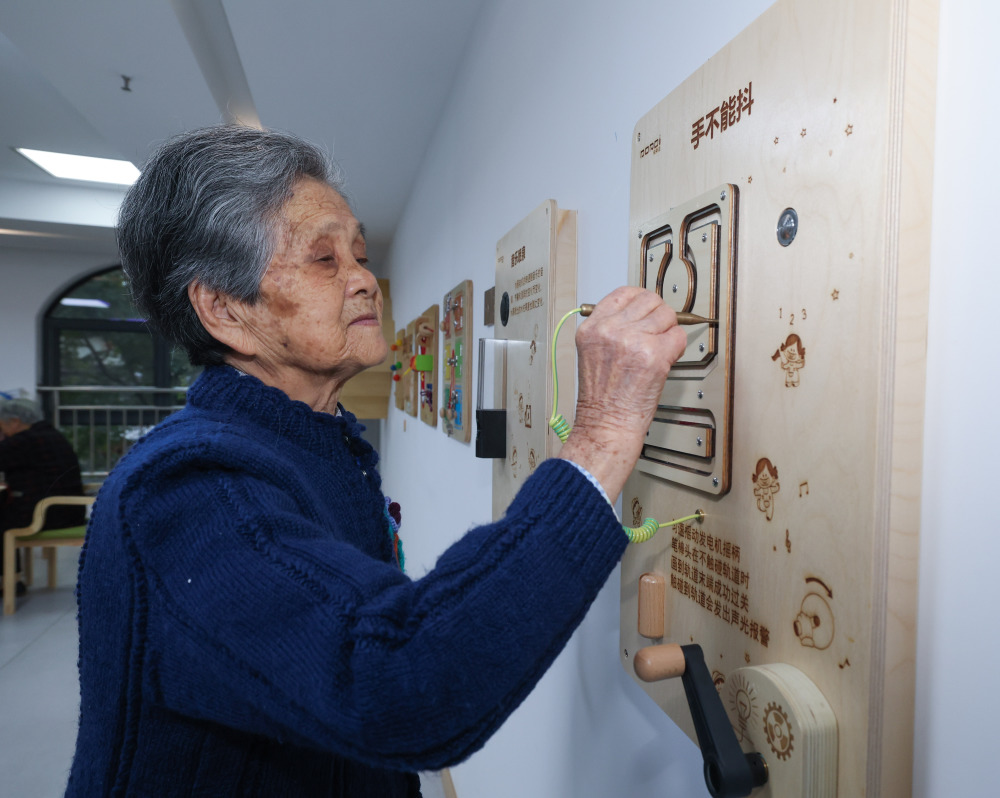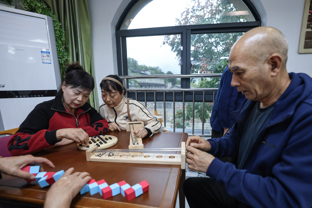 11月10日,在云和县百龄帮凤凰家园长者养护中心的老年木玩活动室内,老人们在玩益智木玩。云和县民政部门积极在多个养老中心推进木玩活动室的建设,活动室以益智类、运动类、康复类、康养类等木制玩具为媒介,帮助老年人动手动脑,保持大脑健康活力。 新华社记者 徐昱 摄