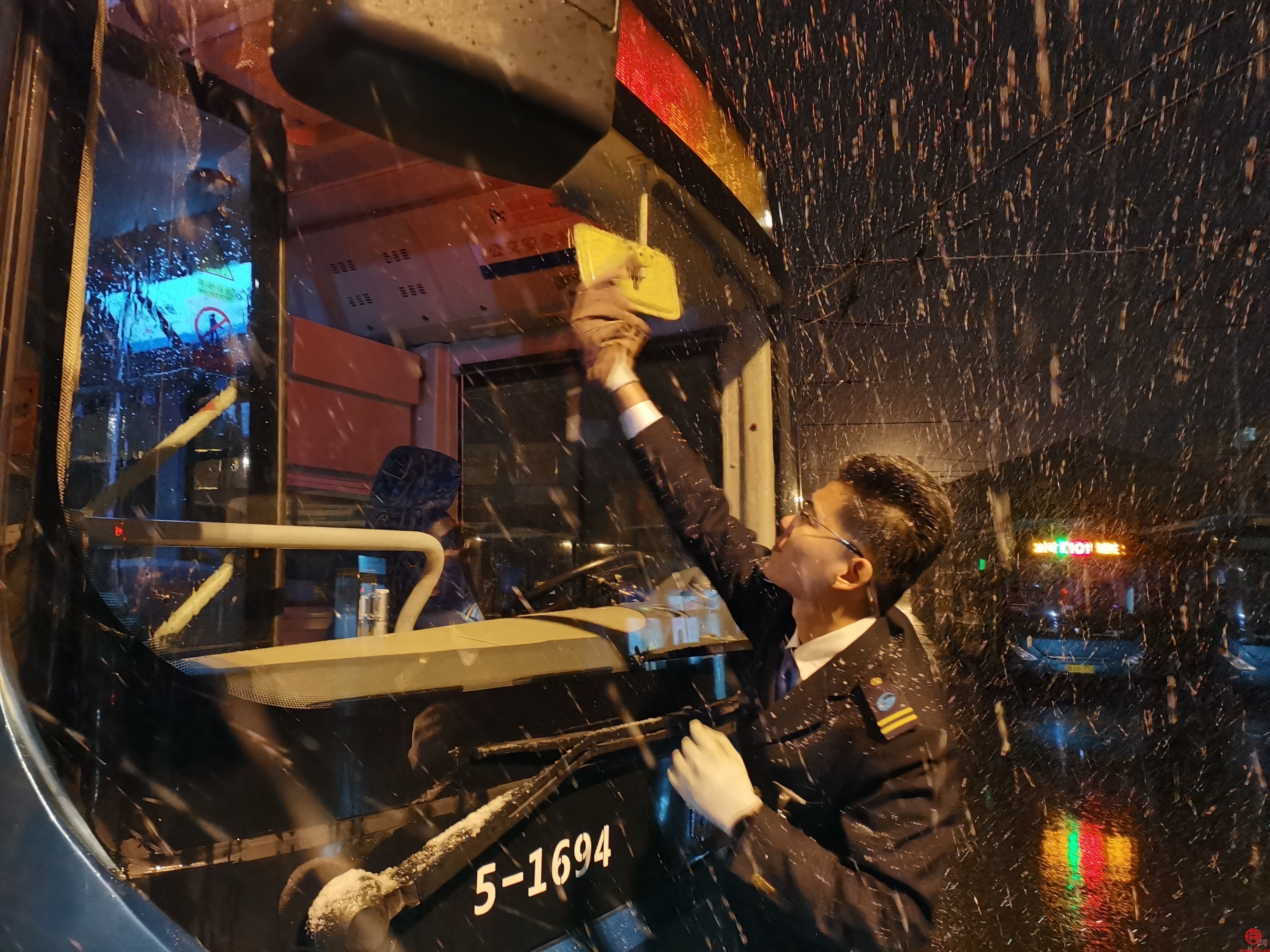 11月10日晚,济南今冬第一场雪如约而至。洁白的雪花从天空飘落,像是为大地换上了新装,大家也都忍不住与雪花来个近距离接触。降雪同步带来了降温、湿滑和出行不便,为保障市民安全顺畅舒适出行,在人们还在睡梦中时,济南公交人已经开始连夜奋战,为市民乘客雨雪低温天气出行提供温暖保障。