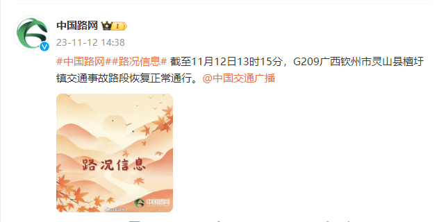 截至11月12日13时15分,G209广西钦州市灵山县檀圩镇交通事故路段恢复正常通行。