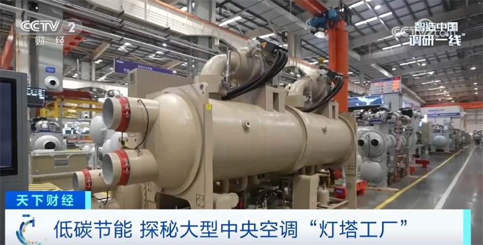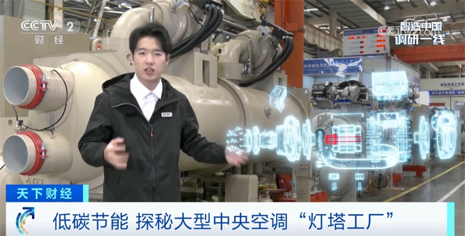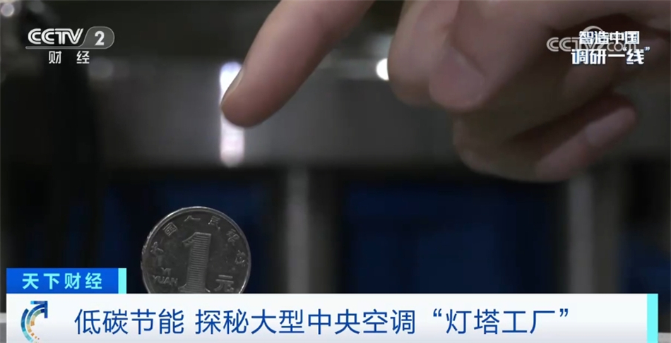 我现在走进的这个区域是空调产线的末端——检测平台。每一台空调出厂前都要在这里经过全方位的检测。眼前这就是一台正在运转的气悬浮中央空调,我们在空调上立了一枚硬币,可以看到是纹丝不动的,这也是气悬浮的特点之一——运行比较平稳。在这块屏幕上显示着空调的出水温度7℃,恒定的出水温度让这台空调产生的冷风非常柔和。目前,这座工厂全流程的自动化生产能够满足从小型商用空调生产到用户需求的大规模定制。目前低能耗、智能化产品已应用在商业地产、酒店、轨道交通等各种场景,极大程度助力着国家“双碳”政策以及各大行业的低碳转型。