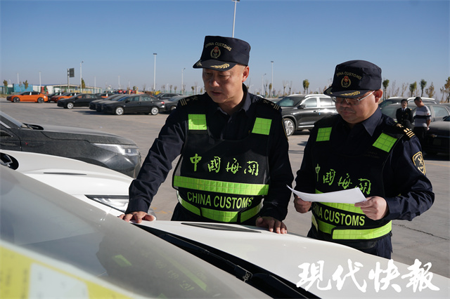 △在新疆喀什综合保税区内的海关施封集中查验作业区,海关关员在查验出口商品车