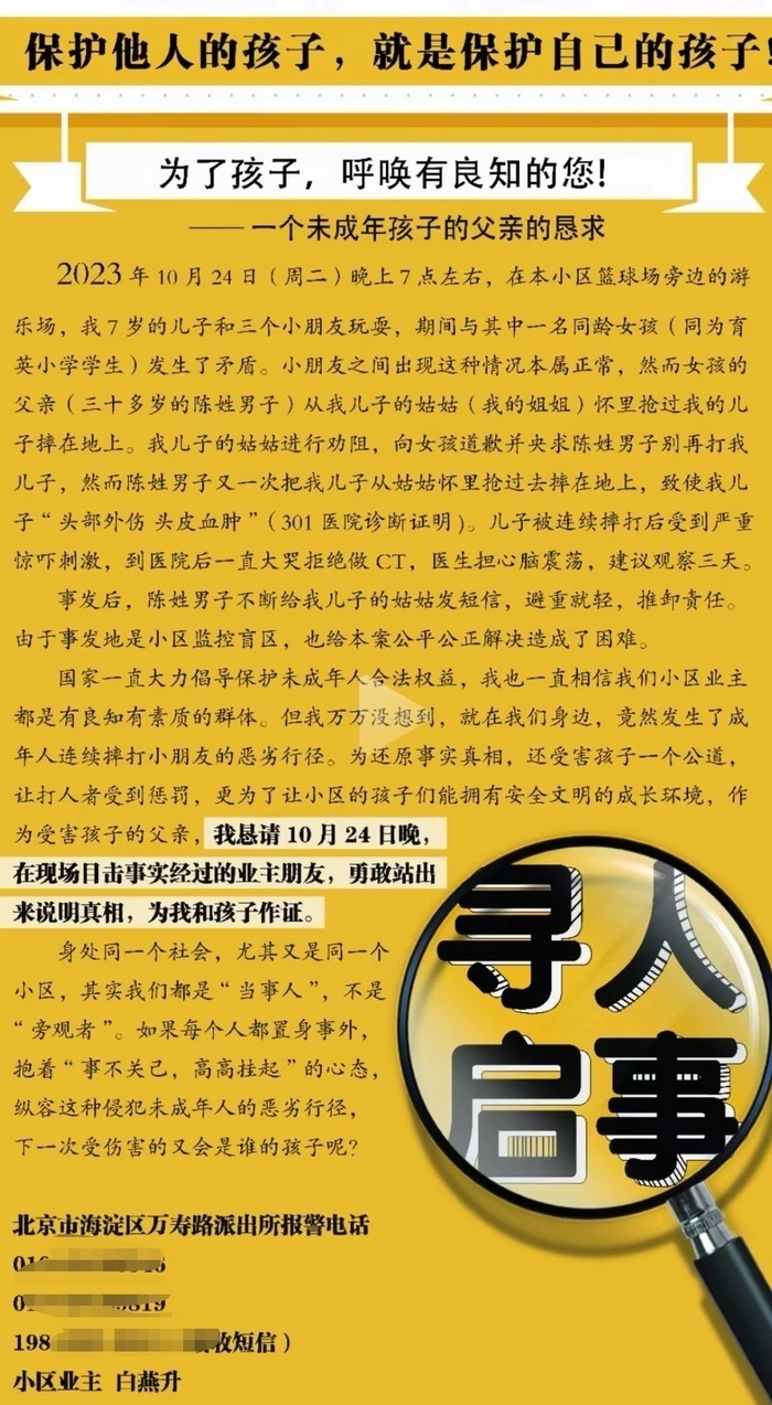 白燕升介绍,10月24日晚上7点左右,在小区游乐场内,其子在玩耍期间与一名同龄女孩发生矛盾,随后,女孩的父亲前后两次从白燕升姐姐怀里夺走小孩并摔在地上,致其“头部外伤头皮血肿”。白燕升称,事发后,涉事男子避重就轻、推卸责任,由于事发地是小区监控盲区,给本案公平公正解决制造了困难,他曾在小区张贴寻人启事,公开恳请当晚在现场目击事发经过的小区业主,站出来说明真相。