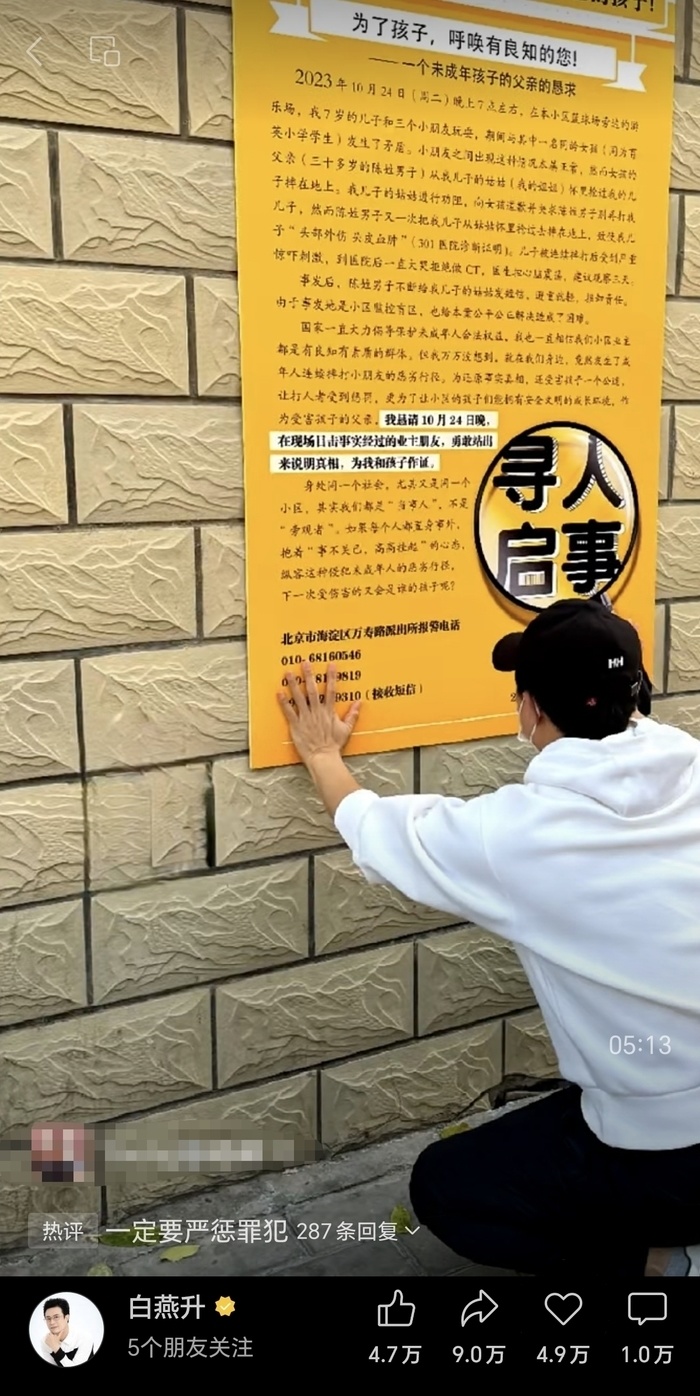 11月12日,知名主持人白燕升发视频称他7岁的儿子在小区内被一男子抱摔后受伤,事发后一度陷入现场目击者不肯作证的取证困境。10月26日,他在小区公开张贴寻人启事,找寻目击证人。白燕升在视频中还呼吁,好人要彼此守护,不能纵容恶行。