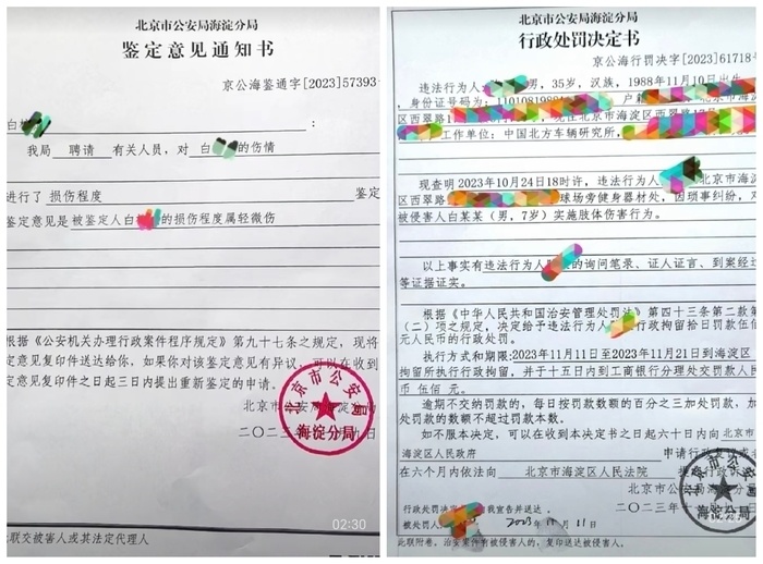 “事发时其实有许多人在场,却无人上前阻止打人者,事后调查取证也不是一帆风顺的,庆幸最终还是有好心人出来。”白燕升在视频中透露,11月9日和11日,海淀公安分局分别开具了伤情鉴定书和行政处罚决定书。据该两份文件显示,对方家长10月24日晚6时许,因琐事纠纷,对7岁的孩子实施肢体伤害行为,致白燕升儿子轻微伤,决定给予违法行为人行政拘留10日、罚款500元的行政处罚。白燕升也在视频中呼吁,好人需要抱团取暖,彼此守护,一定要勇敢。每个人都是当事人,没有旁观者。