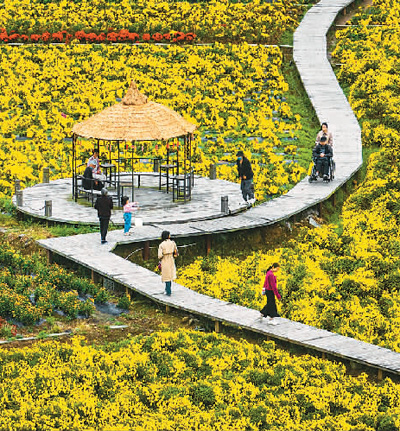 11月11日,游客在浙江省宁波市宁海县力洋镇海头村的菊花园中游玩赏花。 胡学军摄(人民图片)