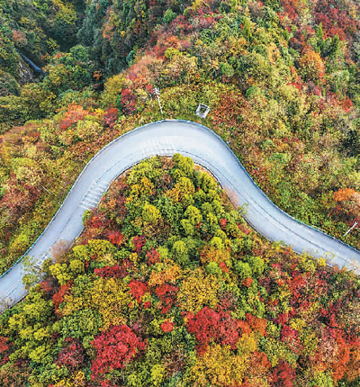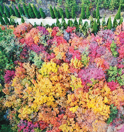 位于北京市昌平区的十三陵国家森林公园蟒山景区是“最美赏秋园”之一。每年10月下旬到11月中旬,这里连绵的山坡就会从郁郁葱葱的绿色逐渐变为红、黄、橙、绿相间,从高处俯瞰,最为壮美,吸引了许多摄影爱好者前来拍摄。