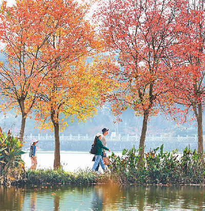 深秋时节,江苏省南京中山植物园色彩斑斓。图为11月5日,游人在中山植物园赏秋游览。 苏阳摄(人民图片)