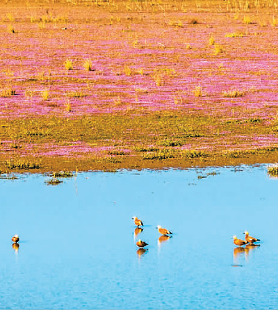 近日,位于江西省九江市都昌县的鄱阳湖湿地里,蓼子花迎来盛花期,成片的紫色小花朵竞相开放。图为蓼子花海。