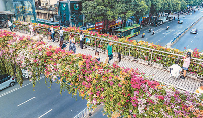 11月5日,广西壮族自治区南宁市青秀区星湖路过街天桥开满各色三角梅,吸引众多市民打卡拍照。 彭寰摄(人民图片)