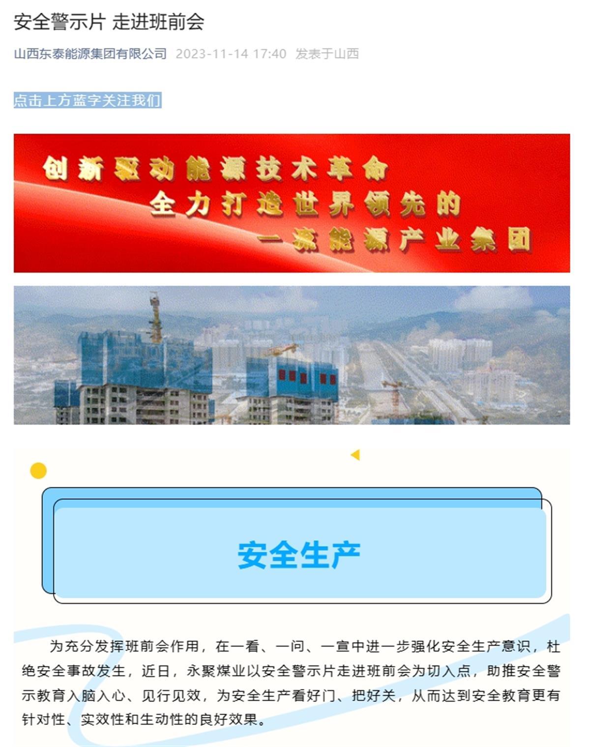 《安全警示片 走进班前会》的微信推文(图源:山西东泰能源集团有限公司微信公众号)