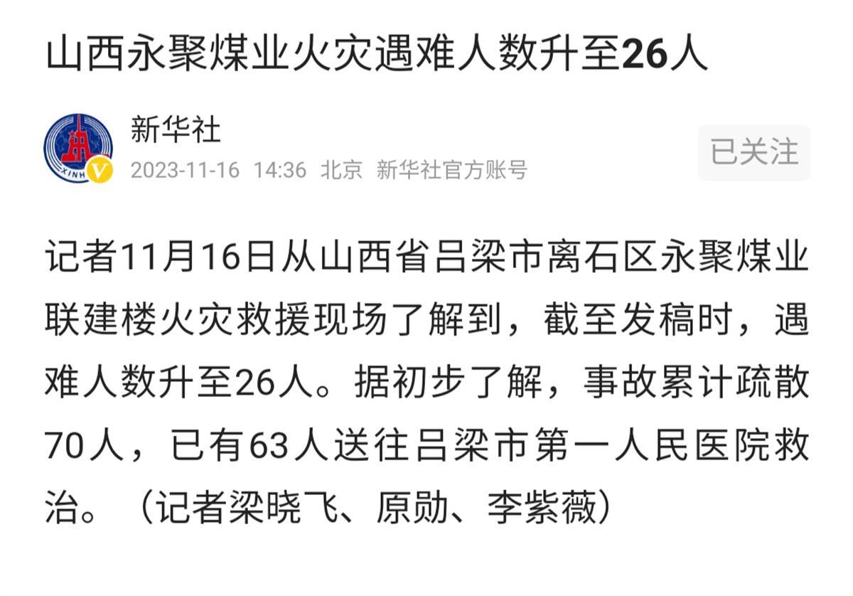 11月16日7时许,山西吕梁市离石区永聚煤业有限公司地面联建楼发生火灾,截至下午2时34分,已有26人遇难。一位当时正在第一人民医院的网友介绍,当时他看见5名伤者送医,情况最好的伤者能自己拿着吊瓶。