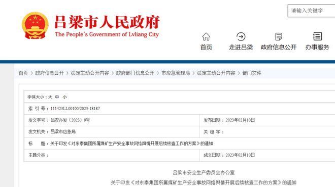 新黄河记者注意到,今年年初,因有网络舆情反映东泰集团所属煤矿瞒报生产安全事故,吕梁市安全生产委员会办公室制定了《对东泰集团所属煤矿生产安全事故网络舆情开展后续核查工作的方案》,并于2月10日通知吕梁市离石区人民政府认真做好配合工作。