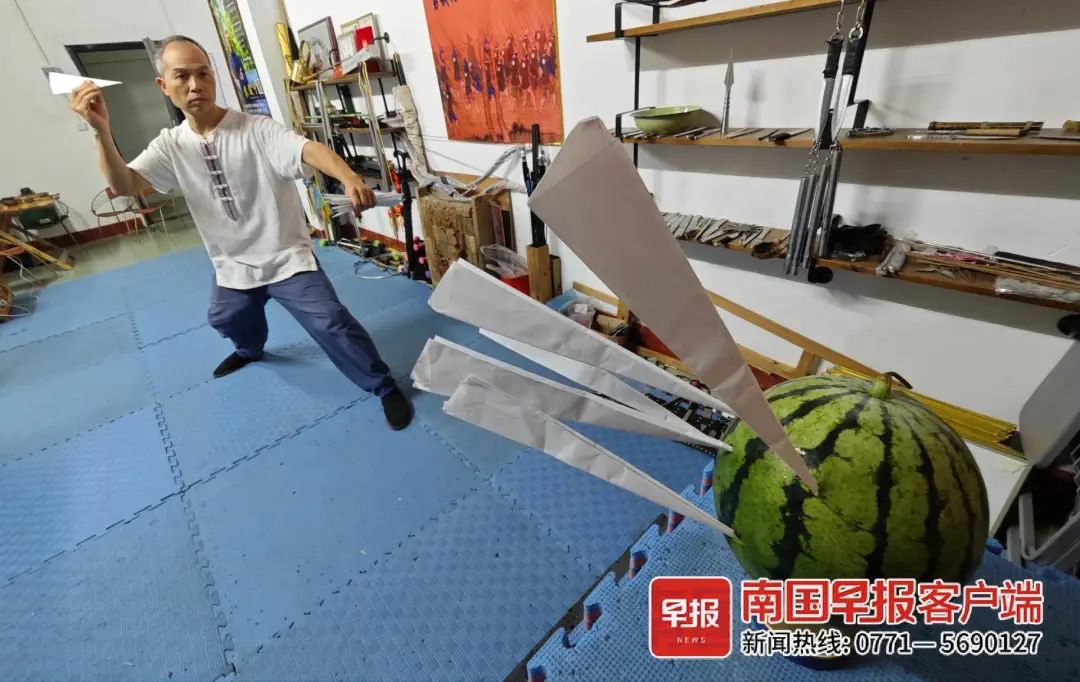 农俊宁在表演“纸镖插西瓜”。何定坚摄