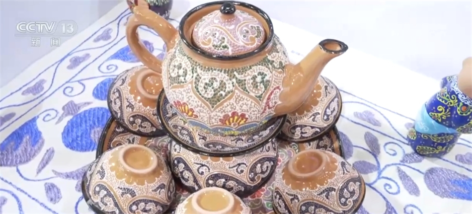 乌兹别克斯坦客商张聪:这(茶具)是乌兹别克斯坦的非物质文化遗产产品,中国的文化里面倒茶是七分满,我们乌兹别克人倒茶是五分满或者三分满,这个茶给你倒得越来越少,说明我越来越尊重你。