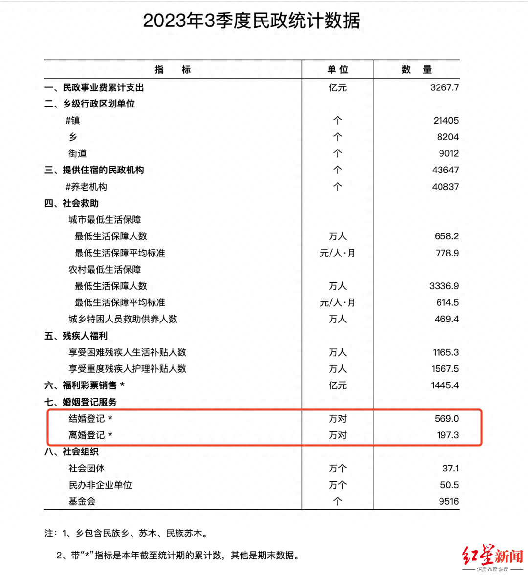 日前,民政部网站发布了《2023年3季度民政统计数据》。据统计,今年前三季度,全国办理结婚登记为569.0万对,办理离婚登记197.3万对。2022年前三季度,全国共办理结婚登记544.5万对,办理离婚登记164.3万对。相较而言,今年前三季度结婚登记量较去年同期增加24.5万对,离婚登记量同比增加33万对。