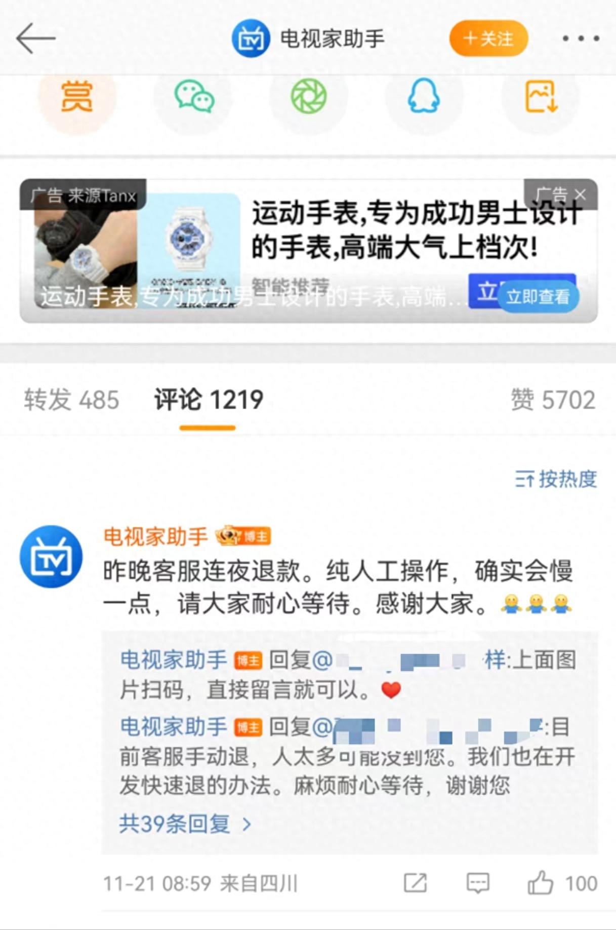在“电视家助手”微博评论区,有网友留言称自己被取消排队,官方回应称是由于退款信息过多导致客服手动回复比较慢,可以再试一试。
