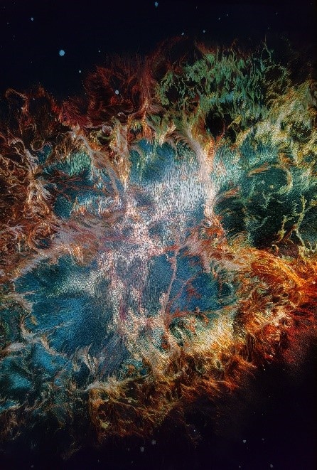 陈英华:当时苏州天文台的一位老师带了一组照片,和我探讨绣这个系列的作品的可能性,一共6幅图案,我挑了蟹状星云,因为它在天文界特别神奇:我们的天体中有好多星云,但这一个是有记载的,它是1054年宋代有记录的超新星爆发,现在研究下来就是这一颗蟹状星云。