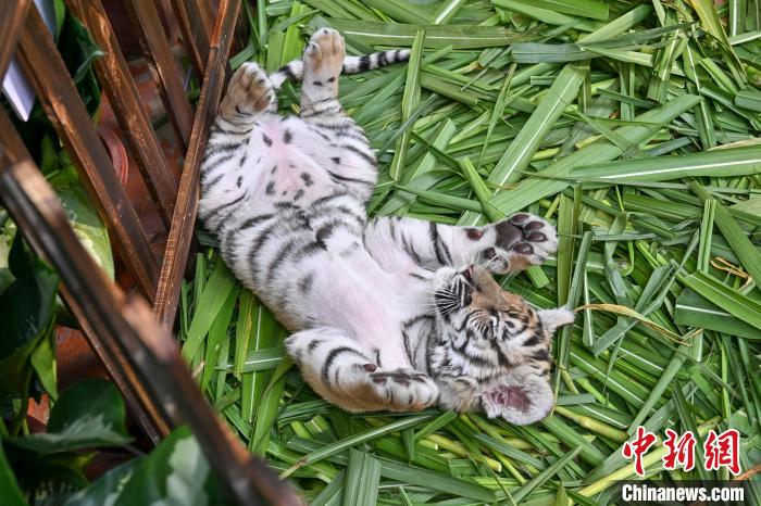 躺在草地上的孟加拉虎宝宝。记者陈骥旻摄