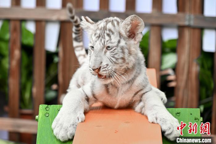 在跷跷板上玩耍的白虎宝宝。记者陈骥旻摄
