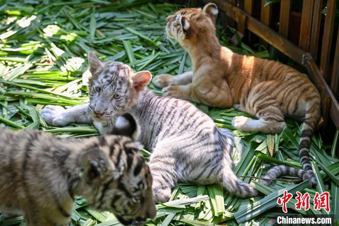 在草地上休憩的孟加拉虎宝宝(前)、白虎宝宝(中)与金虎宝宝(后)。记者陈骥旻摄
