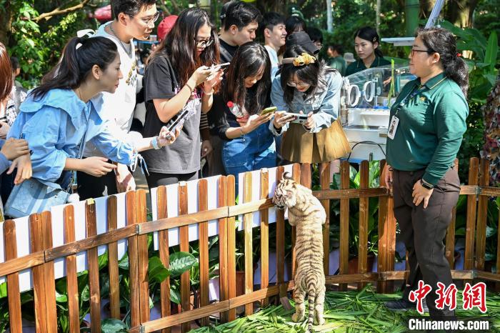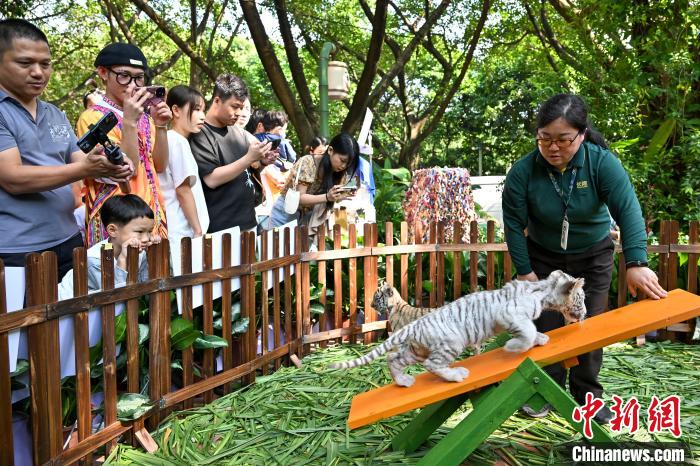 游客近距离观察白虎宝宝与孟加拉虎宝宝。记者陈骥旻摄