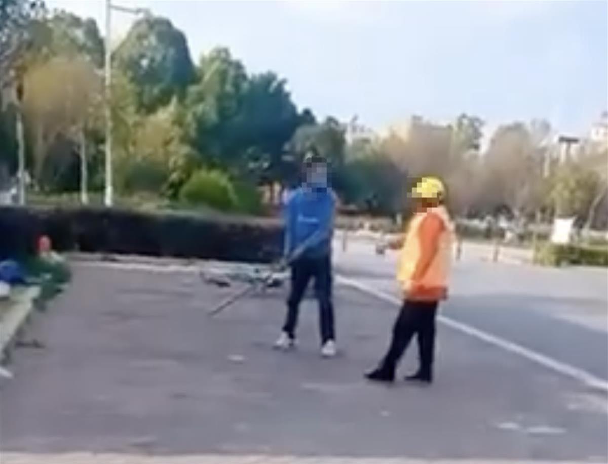网曝男子持长棍击打环卫工腿部(图源:视频截图)