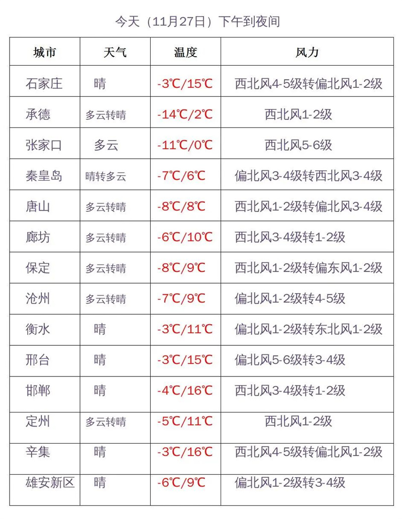 河北省气象台2023年11月27日11时继续发布大风蓝色预警信号:受冷空气影响,预计今天下午到夜间,张家口、承德和保定、石家庄、邢台、邯郸四个地区的西部有西北风4到6级,阵风7到8级;今天夜间,沿岸海域和沿海地区有西北风5到6级,阵风7到8级。请防范!