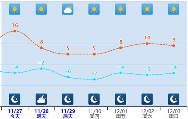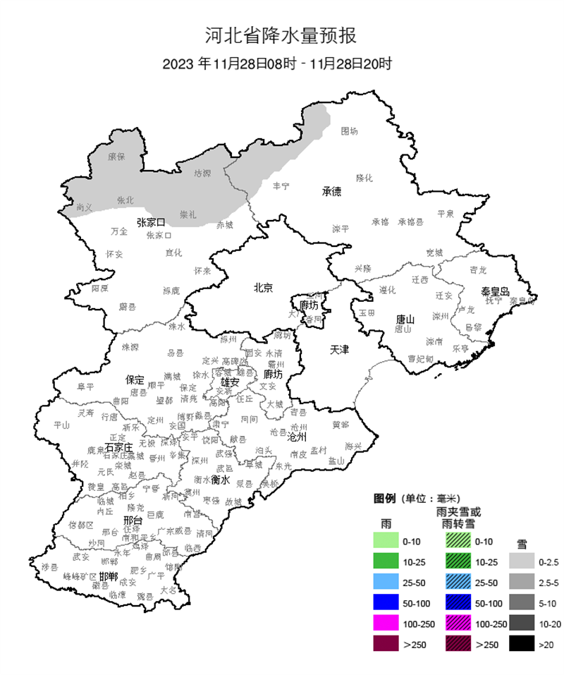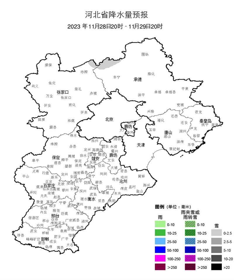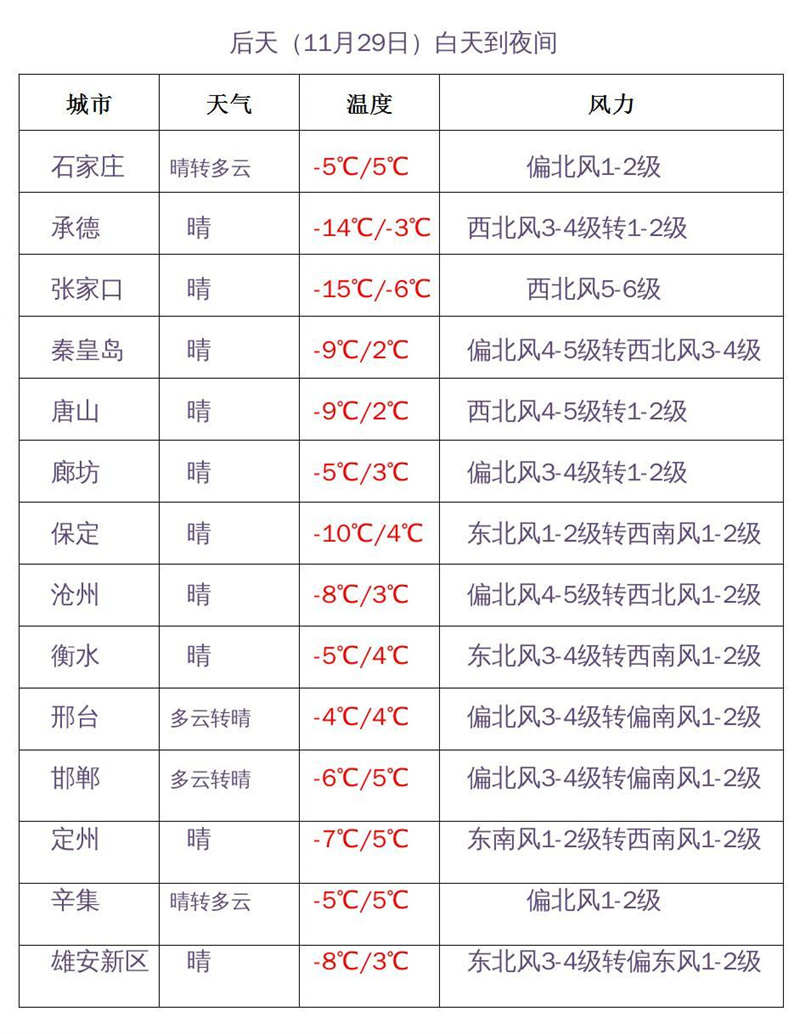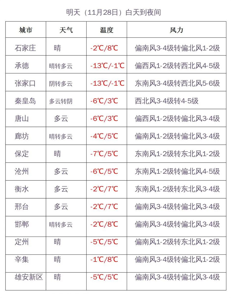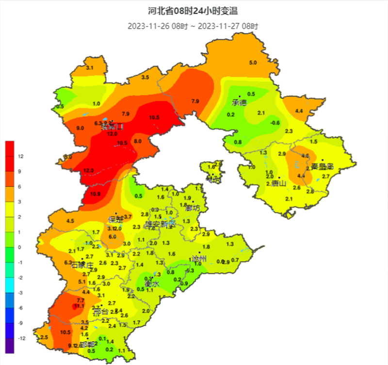 明天早晨,张家口、承德北部最低气温下降6~8℃,承德南部、秦皇岛、唐山和保定、石家庄、邢台、邯郸四个地区的西部下降3~5℃。